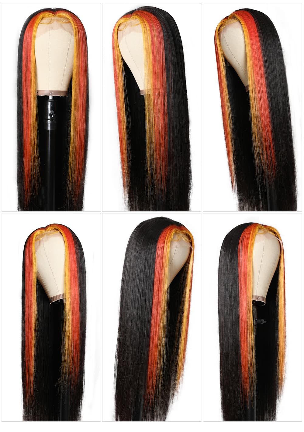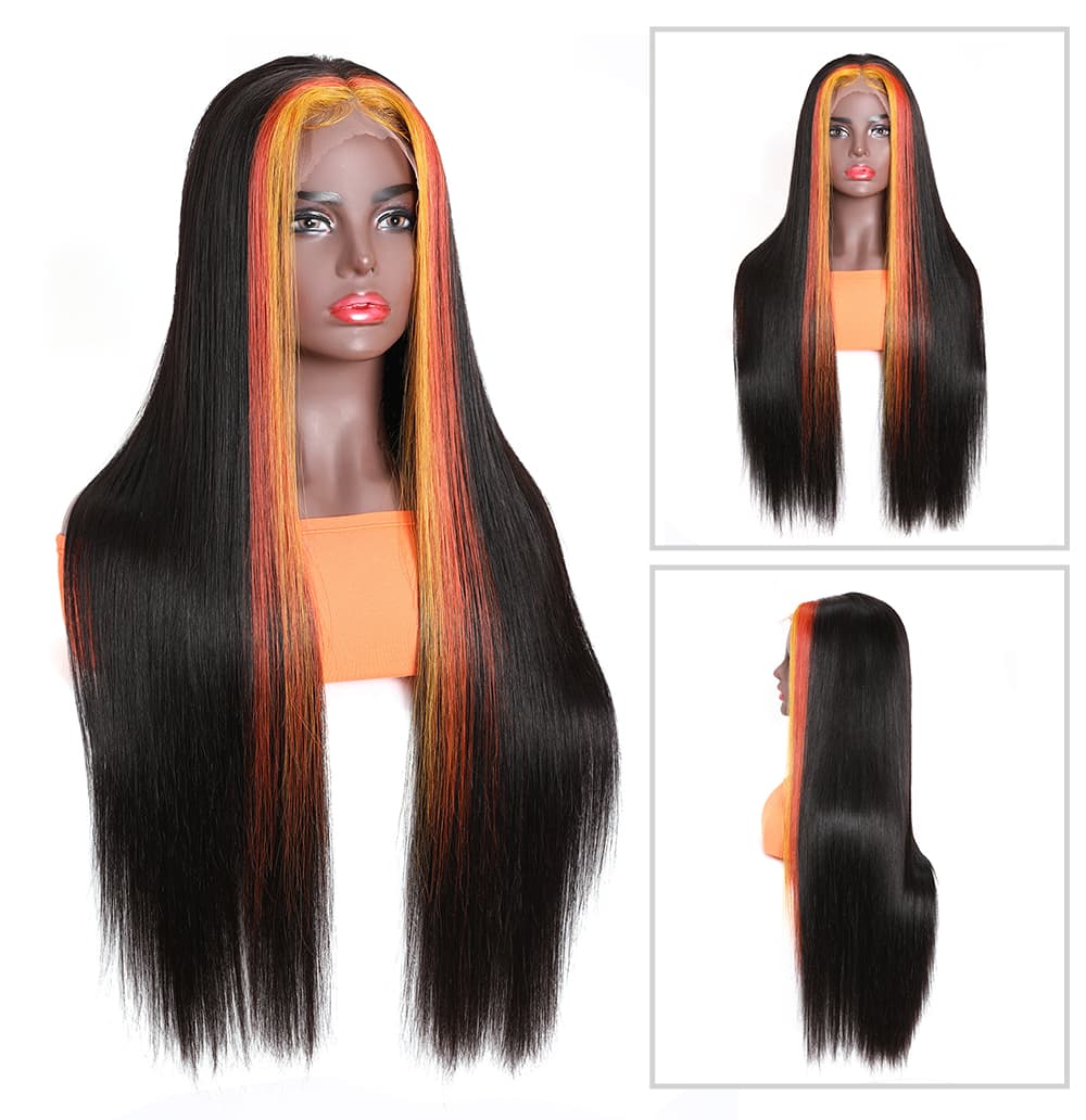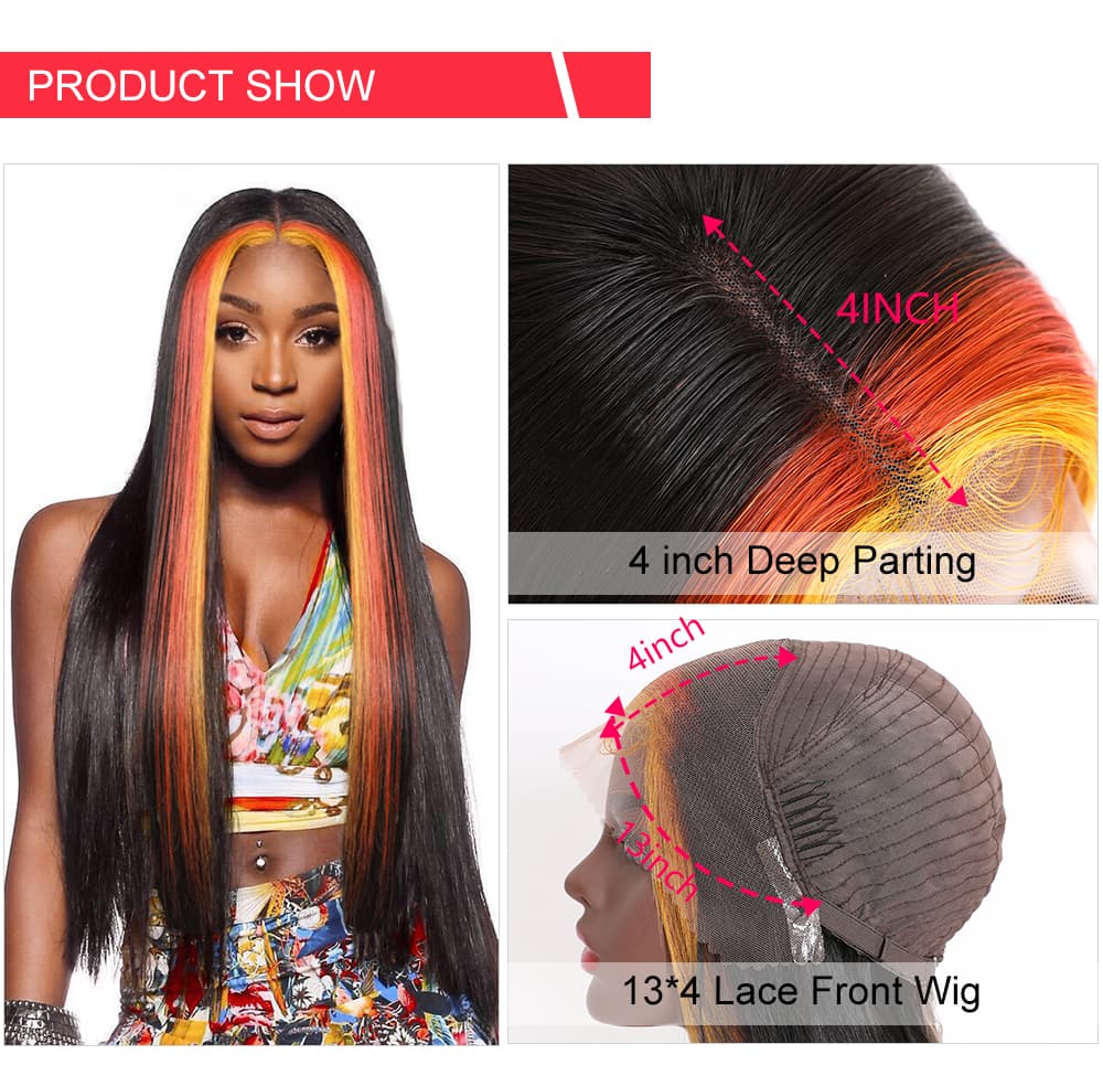 Incolorwig Highlight 13*4 Lace Frontal Wig 150% Density Natural Black Mixed Orange And Yellow Straight Wig