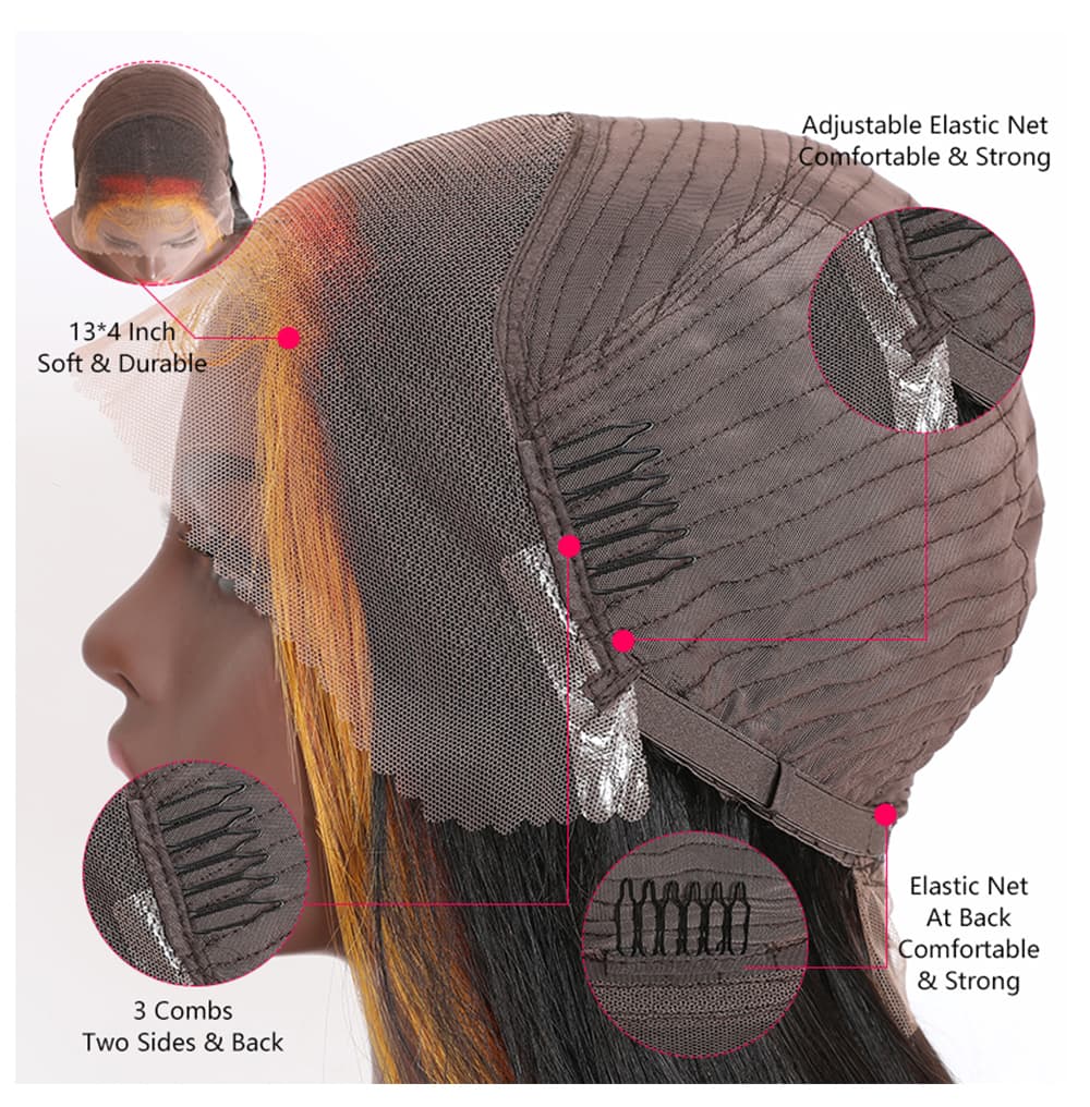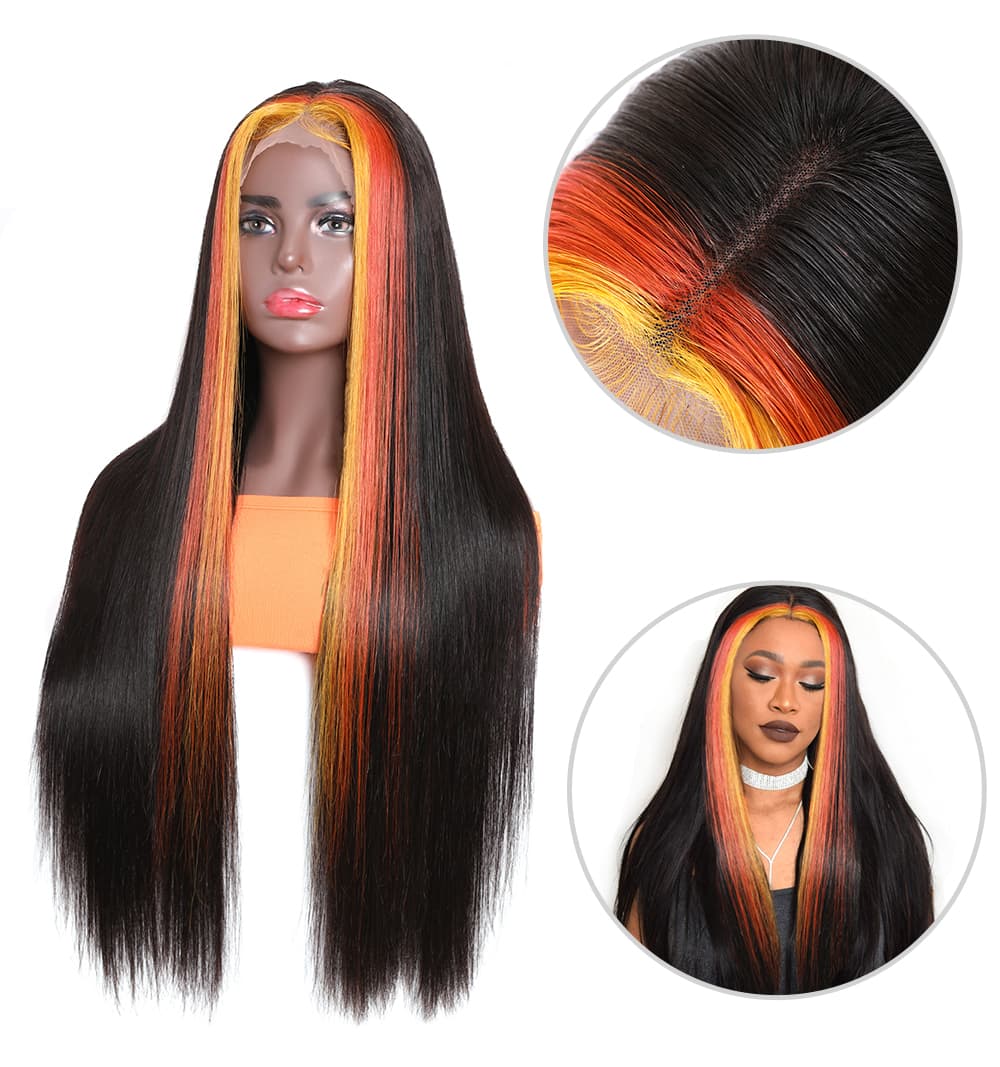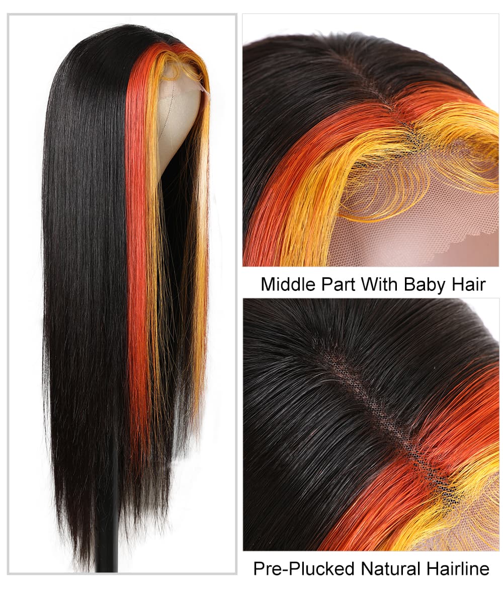 Incolorwig Highlight 13*4 Lace Frontal Wig 150% Density Natural Black Mixed Orange And Yellow Straight Wig