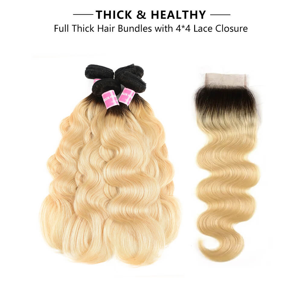 Incolorwig New Arrival #T1B613 Ombre Color Body Wave Brazilian 4 Bundles Hair With 4*4 Free Part Lace Closure