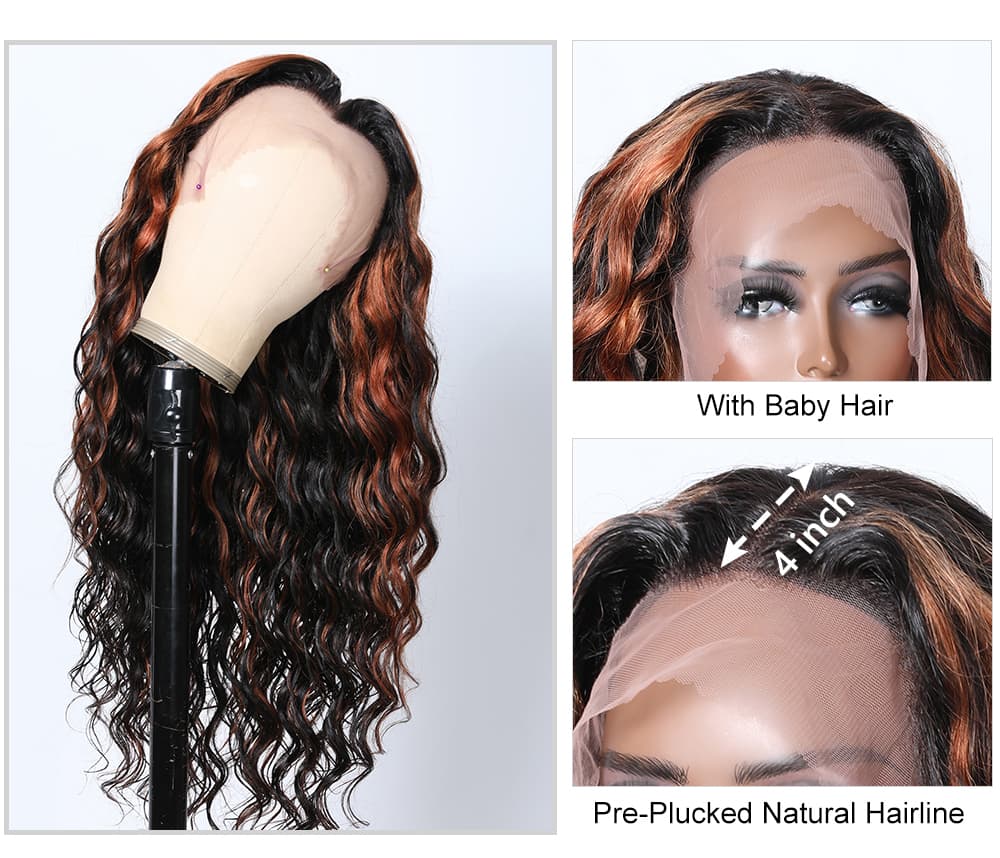 Incolorwig Ombre 13x4 Deep Wave Lace Front Human Hair Wig Natural Color With Copper Highlight Wigs