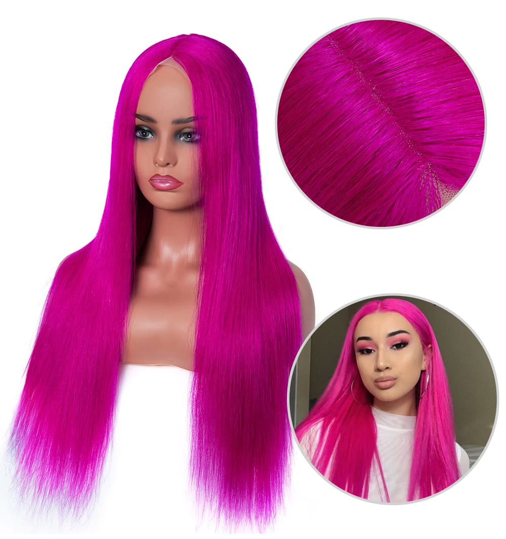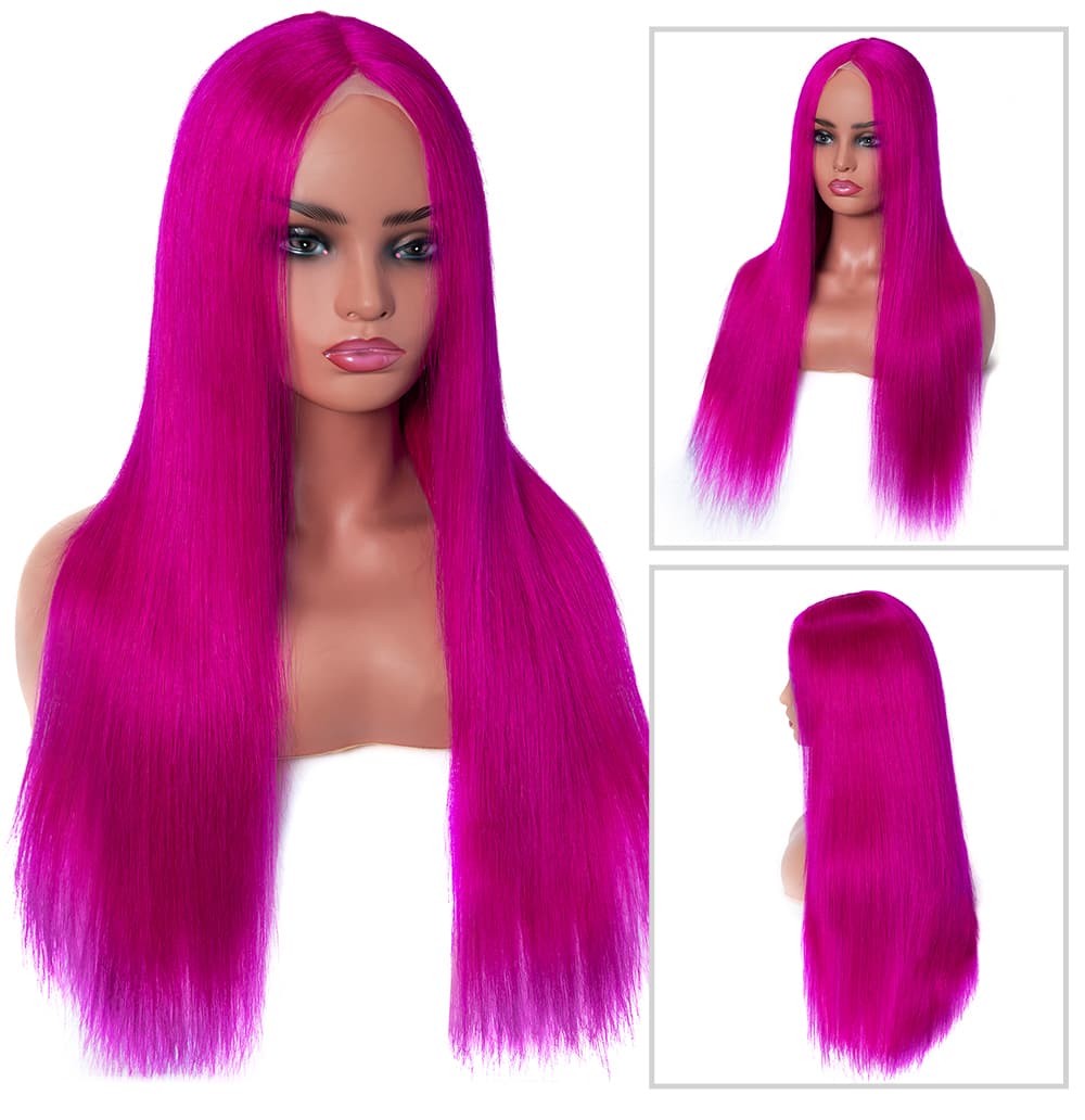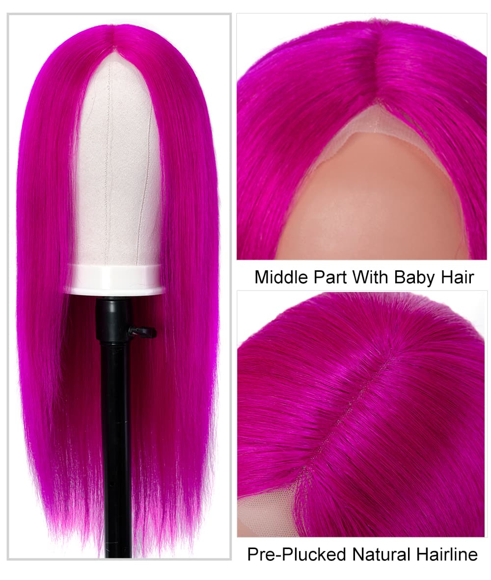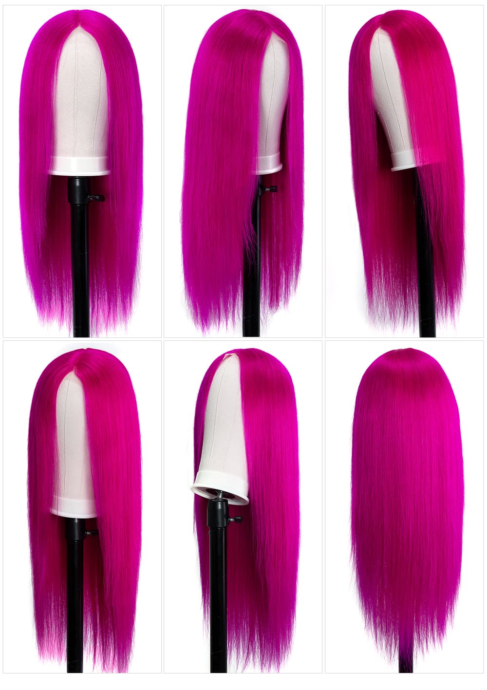Incolorwig Rose Red Straight Human Hair Wig Hairline Lace Part 150% Density Middle-part Fake Scalp Wig